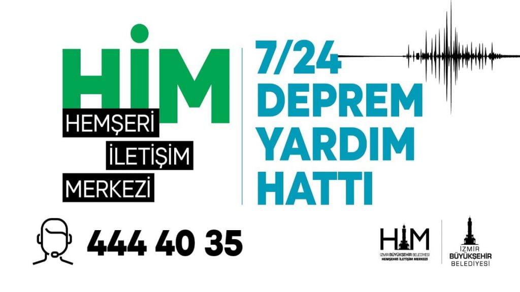 Deprem nedeniyle talebi, sorunu olan tüm vatandaşlar İzmir HİM’in 444 40 35 ve 185 numaralı hatlarına ulaşabilir. İstekleriniz titizlikle değerlendiriliyor. İzmir Büyükşehir Belediyesi Ekipleri Hizmetinizde.