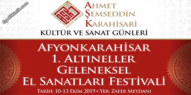 Afyonkarahisar İl Kültür ve Turizm Müdürlüğü ve Afyonkarahisar Belediyesi koordinesinde düzenlenen, Ahmed Şemseddin Karahisari AŞK Kültür ve Sanat Günleri kapsamında; Afyonkarahisar 1. Altıneller Geleneksel El Sanatları Festivali Zafer Meydanı’nda düzenlenecek. 10 ve 13 Ekim tarihleri arasında olacak olan festivalde, Afyon iline özgü el sanatları işleri ve eserleri sergilenecek, ziyaretçilere tanıtılacak. Sergi dışında söyleşiler, stantlar, yöresel dans gösterileri, müzik dinletileri ve konserler gerçekleşecek. Tüm Afyonkarahisar halkı davetlidir.