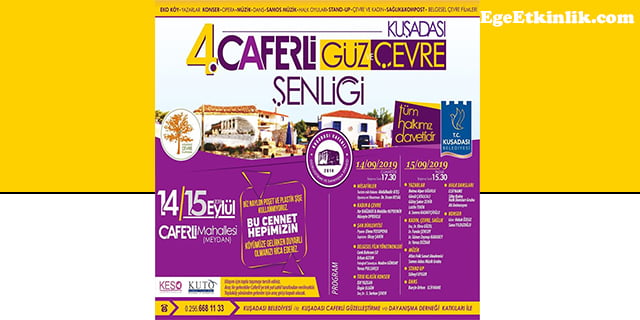 Kuşadası Belediyesi ve Caferli Güzelleştirme ve Dayanışma Derneği katkılarıyla düzenlenen şenlik kapsamında, İmza Günleri, Halk Oyunları, Stand up, Konferans, Dans, Opera ve Müzik dinletileri sizlerle buluşacak.