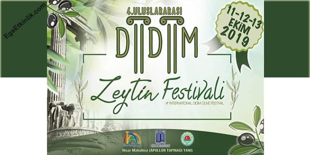 Didim Belediyesi, Didim Ziraat Odası ve İlçe Tarım ve Orman Müdürlüğü’nün ortaklaşa organize ettiği Zeytin Festivali’nin bu sene 4.sü gerçekleşecek. Bölgedeki zeytin üretimini arttırmak, bölge zeytinini Türkiye’ye tanıtmak ve çevre ekonomisine destek olmak amacıyla düzenlenecek festivalde yöresel zeytinler tanıtılacak. Festival alanında kurulacak stantlarda tanıtım ve satış yapılacak. Ziyaretçiler için gösteriler, söyleşiler ve konserler gerçekleşecek.