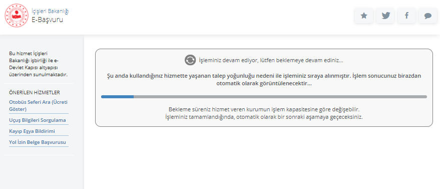 - İçişleri bakanlığı tarafından yoğunluk sebebiyle meydana gelen sorunlarla ile ilgili iyileştirme çalışmaları devam etmektedir. Sorunu devam eden vatandaşlar ilerleyen saatlerde tekrar denemelidir.