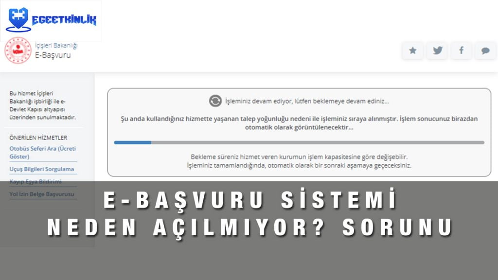 - E-devlet üzerinden E-başvuru sistemine girmeye çalıştığında yukarıdaki gibi ekranla karşılaşan vatandaşlar yoğunluk sebebiyle bir süre beklemelidir. Sayfayı yenilemek bazen sorunu giderebiliyor. Sayfayı yenileyin ve tekrar deneyin.