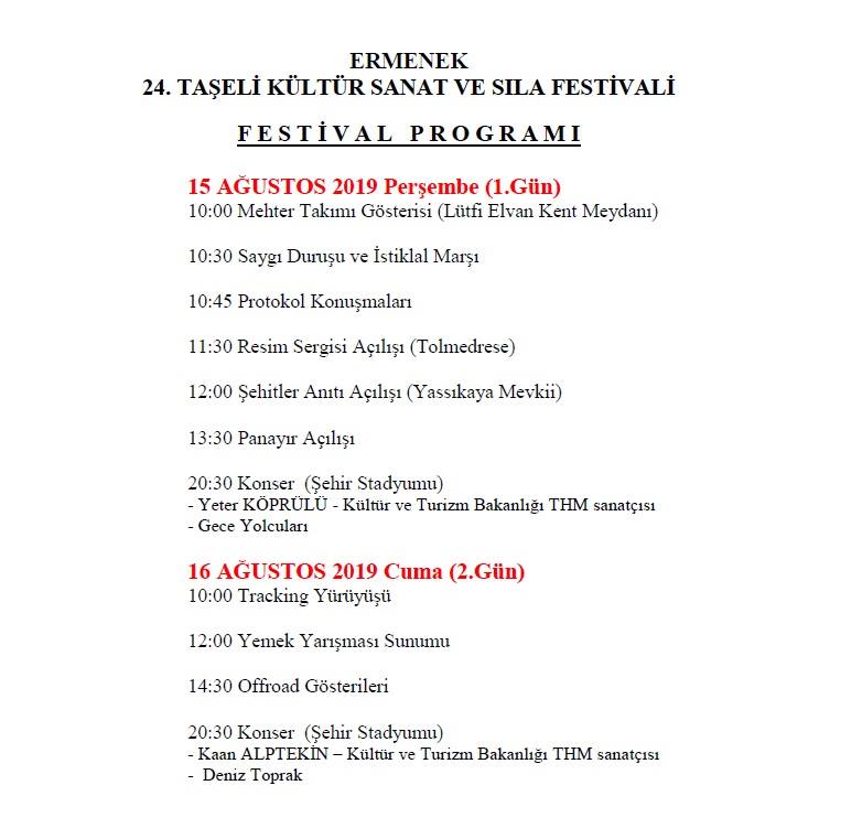 Karaman ilçesine bağlı Ermenek te bu sene 24.sü düzenlenecek Taşeli Kültür Sanat ve Sıla Festivali, 15 – 16 Ağustos 2019 tarihlerinde çeşitli etkinlik ve konserlerle gerçekleşecek.