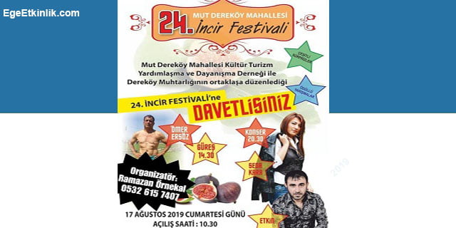 Mut Dereköy Mahallesi Kültür, Turizm, Yardımlaşma ve Dayanışma Derneği ile Dereköy Muhtarlığı’nın ortaklaşa düzenlediği 24.İncir Festivali bu sene de renkli görüntülere sahne olacak. Mersin Büyükşehir Belediye Başkanı Vahap Seçer’in de ziyaret edeceği festivalde güreş, konser ve dans gösterileri ile vatandaşların eğlenceli vakit geçirmeleri sağlanacak.