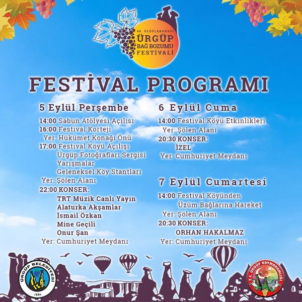Ürgüp’ün en önemli kültürel faaliyetlerinden olan ve Ürgüp Belediyesi öncülüğünde bir çok kurum ve kuruluşun desteği ile 48 yıldır hayata geçirilen Ürgüp Uluslararası Bağ Bozumu Festivali bu yıl 14 ve 15 Eylül tarihlerinde Ürgüp’ün girişinde bulunan Üç güzeller Mevkii Festival Alanı’nda gerçekleştirilecek. Festival kapsamında 14 Eylül günü Ürgüp’te çarşı merkezinde yerli yabancı misafirlere ve vatandaşlara üzüm ikram edilmeye başlayacak. 2 gün boyunca Ürgüp’te tonlarca Ürgüp üzümü dağıtılacak.