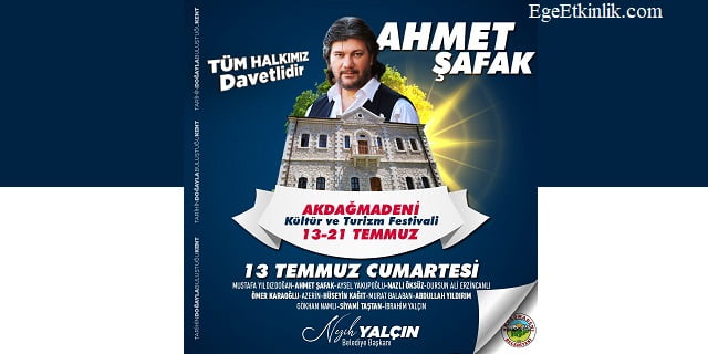 Türk müzisyen, bestekâr, söz yazarı, yazar ve oyuncu Ahmet Şafak, Akdağmadeni Kültür ve Turizm Festivali kapsamında 13 Temmuz tarihinde ücretsiz bir konser verecek.