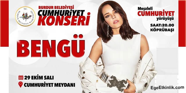 İçimden Gelmiyor, Unut Beni, Sanki gibi şarkıları ve renkli kişiliği ile tanınan güzel şarkıcı Bengü, Burdur Belediyesi’nin düzenlemiş olduğu 29 Ekim Cumhuriyet Bayramı etkinlikleri kapsamında halk konseri verecek. Cumhuriyet Meydanı’nda gerçekleşecek konser öncesinde saat 20:00 Köprübaşı’nda alana doğru meşaleli Cumhuriyet Yürüyüşü gerçekleşecek.