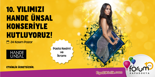 Müzik dünyasının güzel isimlerinden Hande Ünsal, Nevşehirli sevenleri ile buluşmaya hazırlanıyor. 24 Kasım’da Nevşehir’e gelecek sanatçı Forum Kapadokya’da sahne alacak. Nevşehir’in gözbebeği Forum Kapadokya’nın 10. yaş kutlamaları kapsamında yer alan etkinlikte ayrıca çeşitli gösteriler, indirimler ve pasta kesimi de gerçekleşecek. Tüm Nevşehir halkı davetlidir.