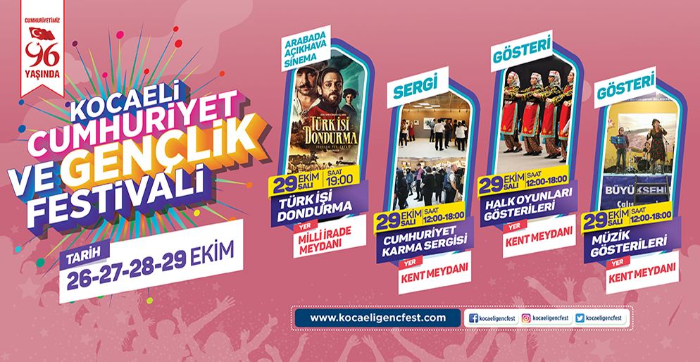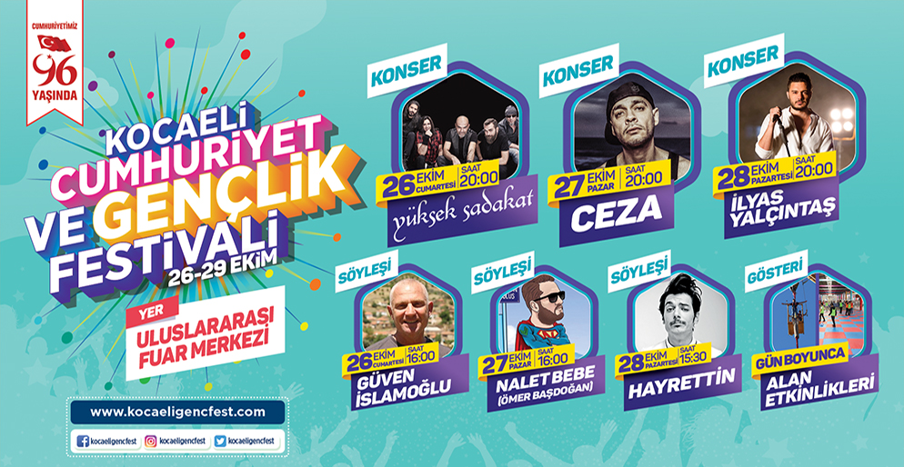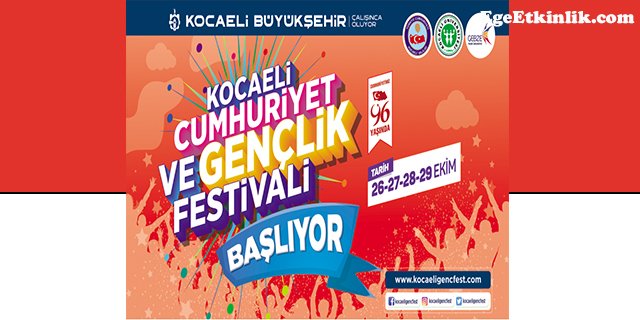 Kocaeli Büyükşehir Belediyesi tarafından 29 Ekim Cumhuriyet Bayramına özel organize edilen Cumhuriyet ve Gençlik Festivali, 26-29 Ekim 2019 tarihlerinde gerçekleşecek.