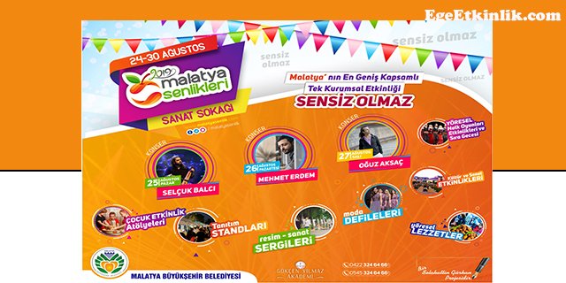 Malatya ‘nın en geniş kapsamlı festivali olan Malatya Şenlikleri, 24 – 30 Ağustos 2019 tarihleri arasında Sanat Sokağında çeşitli etkinlik ve konserlerle gerçekleşecek.