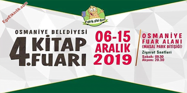 Osmaniye Belediyesi tarafından kitapseverler için 4. kez düzenlenecek olan kitap fuarı 6 ve 15 Aralık tarihleri olarak belirlendi. Girişlerin ücretsiz olacağı fuar yine Masal Park Bitişiği’ndeki Osmaniye Fuar Alanı’na kurulacak. 100’lerce yayınevi ve 100.000’lerce ziyaretçinin gelmesi beklenen organizaston’un onur konuğu ise Canan Tan. Tüm Osmaniye halkı davetlidir.