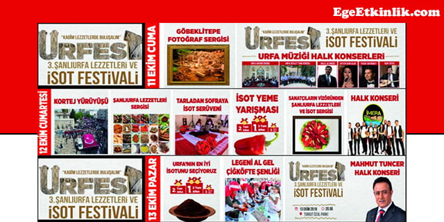 Şanlıurfa da 3. kez düzenlenecek URFEST Şanlıurfa Lezzetleri ve İsot Festivali bu sene, 11 – 12 – 13 Ekim tarihleri arasından çeşitli etkinlik ve konserlerle yerli ve yabancı turistin ilgi odağı olacak.