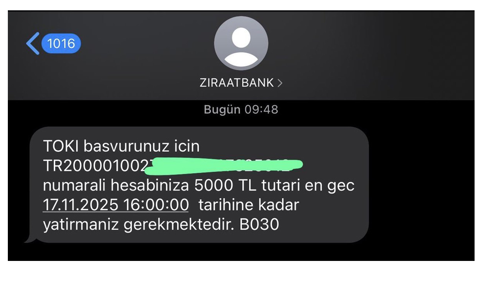 TOKİ başvurunuz için IBAN numaralı hesabınıza 5000 TL tutari en geç belirlenen tarihe kadar yatırmanız gerekmektedir.