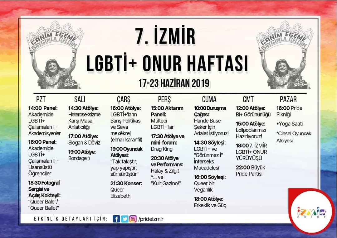 7.İzmir LGBTİ+ Onur Haftası ve etkinlikleri 17 ve 23 Haziran tarihleri arasında İzmir’in çeşitli yerlerinde yapılacak.
