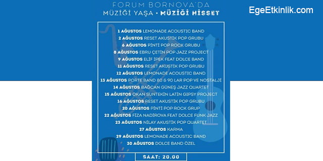 İzmir Forum Bornova’da her ay olduğu gibi Ağğustos ayında da canlı müzik dinletileri devam ediyor. Amatör grupların çaldıkları müzikler “Müziği Yaşa” ve “Müziği Hisset” mottosuyla dinleyicilerle buluşuyor. Müzik dinletileri belirli tarihlerde Temmuz ayı boyunca saat 20:00’de. Sakın kaçırmayın.