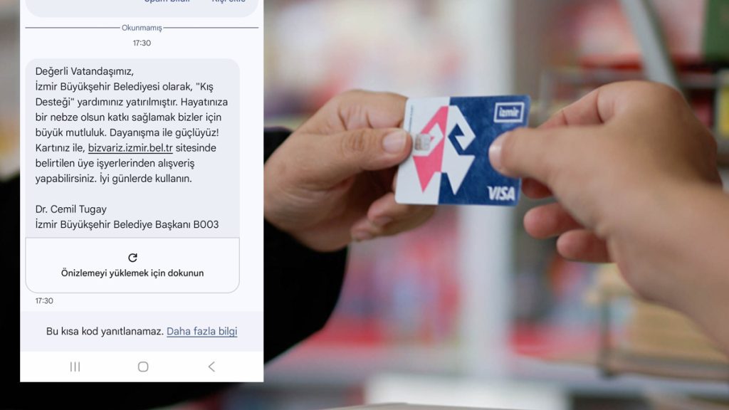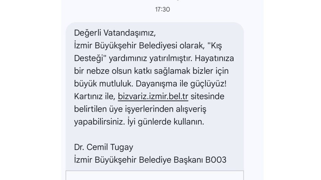 İzmir Büyükşehir Belediyesi kış desteği 1000 TL olarak yatırılmaktadır. İzmirim Kartınıza yatırılan bakiye ile alışveriş yapılmaktadır. Nakdi olarak çekilmemektedir.
