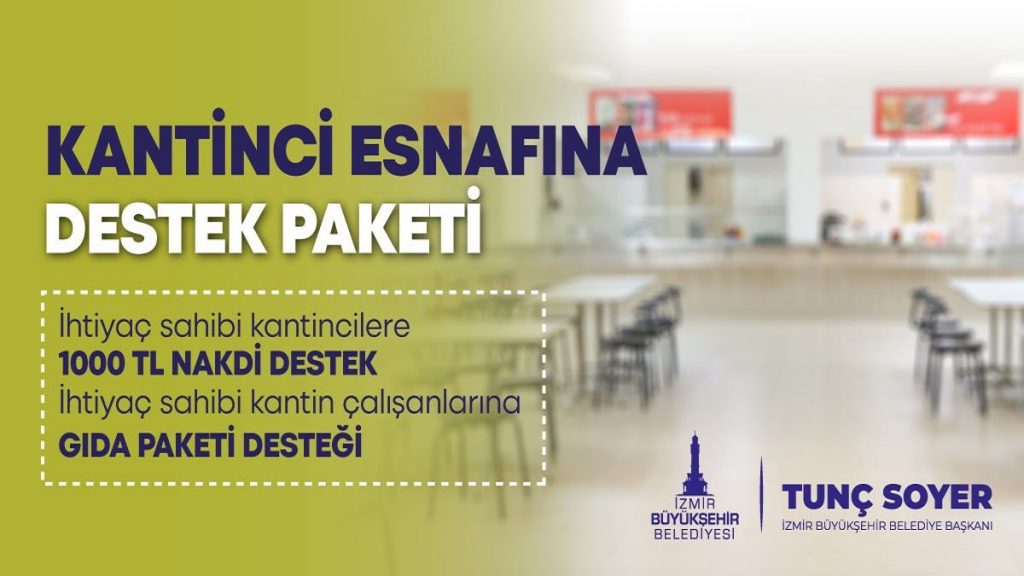İzmir Büyükşehir Belediyesi, salgın ve yasaklar dolayısıyla ekonomik zorluk çeken kantinci esnafına 1000 TL nakdi destek sözü verdi. Ayrıca gelir kaydı yaşadığı tespit edilen kantin çalışanlarına da Gıda Paketi Desteği verilecek.
