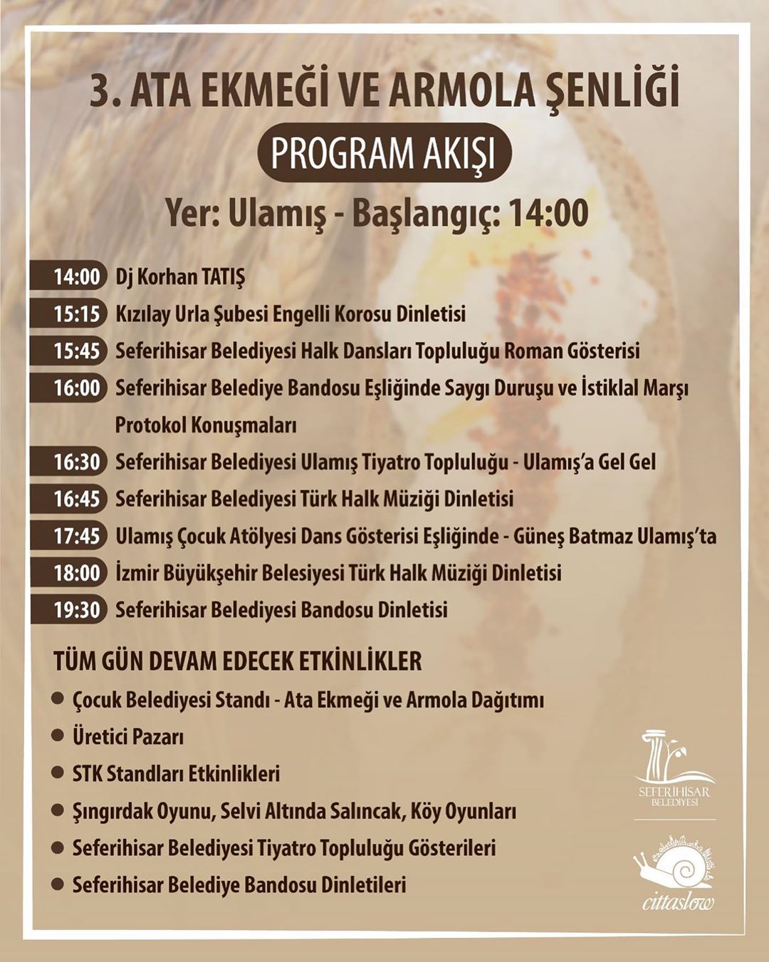 Seferihisar Belediyesi tarafından çok az rastlanan Topan Karakılçık Buğday Tohumu çoğaltılıp yüzlerce yıl önce yapılan tekniklerle “Ata Ekmeği”ni üretti. Meşhur Seferihisar peyniri Armola ile ata ekmeğinin buluşması adına düzenlenen şenlikte çeşitli gösteriler, yöresel oyunlar ve konserler siz değerli ziyaretçilerle buluşacak.