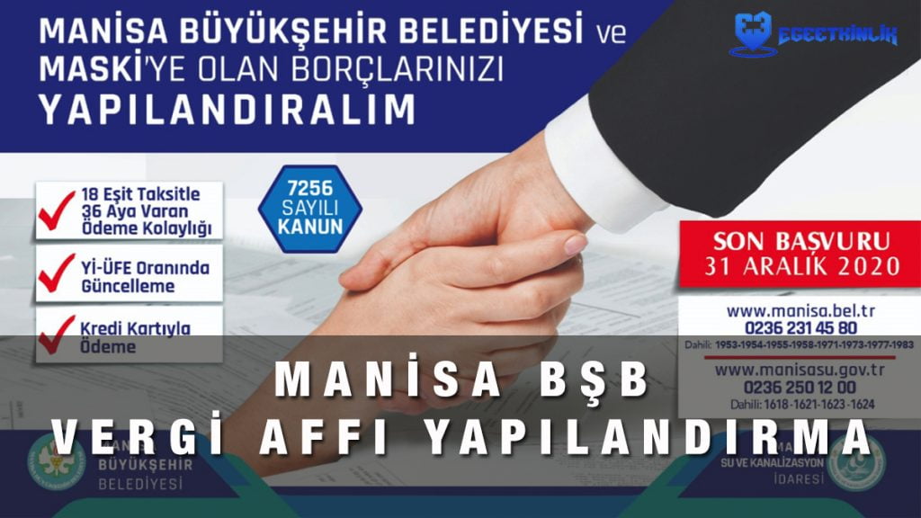 Manisa Büyükşehir Belediyesi borcu olanlar için Vergi Affı Yapılandırma Başvuruları başladı. Son Gün: 31 Aralık 2020. Peki başvuru nasıl yapılacak?, Çevre Temizlik Vergisi Borcu ödeme!, Manisa Online İşlemler!, Emlak Vergisi!, İlan Reklam Vergisi!, Maski Su Faturası Borcu ödeme!, işte detaylar;