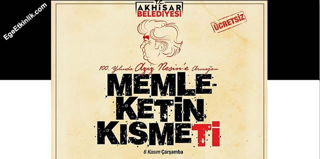 Usta isim Aziz Nesin’in anısına Akhisar Belediyesi katkıları ile 6 Kasım’da Park İçi Sinema Salonu’nda Memleketin Kısmeti adlı oyun sahnelenecektir.