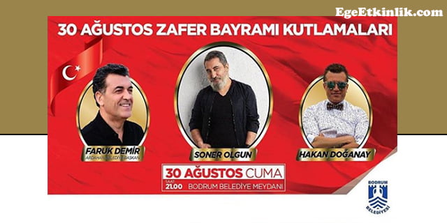 30 Ağustos Zafer Bayramı kapsamında Bodrum Belediyesi’nin düzenlediği kutlamalar kapsamında sahne alacak olan Soner Olgun, sevilen şarkılarını sizler için seslendirecek. Konser öncesi de Hakan Doğanay sizlerle buluşacak.