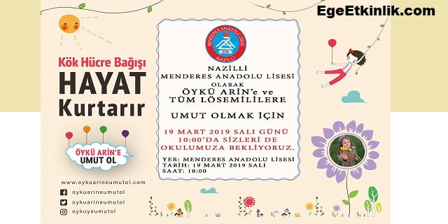 Öykü Arin ve tüm lösemilere ümit olmak için, Nazilli Menderes Anadolu Lisesi’de kök hücre ve kan bağışı kampanyası gerçekleştirilecektir.
